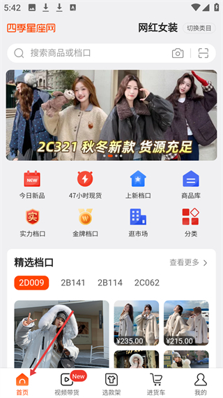 2、首页设搜索栏,有秋冬新款货源活动,分类含今日新品等板块,展示精选档口女装,助力查找女装货源。