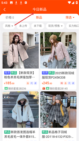 3、今日新品展示多款女装如羊羔毛外套、羽绒服饰,标注价格档口,可按价格风格筛选,方便选购新款女装。