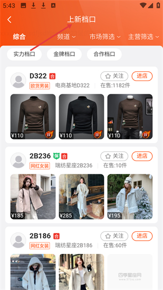 4、上新档口展示实力、金牌档口的女装如毛衣、外套,标注价格在售量,可关注或进店,助力对接女装货源档口。