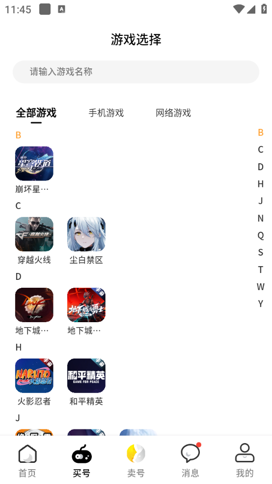 3、在买号页面,展示着详细的游戏账号交易分类,涵盖王者荣耀、蛋仔派对、和平精英等热门游戏;此外,用户还能借助页面上方的关键词搜索框来查找目标账号。