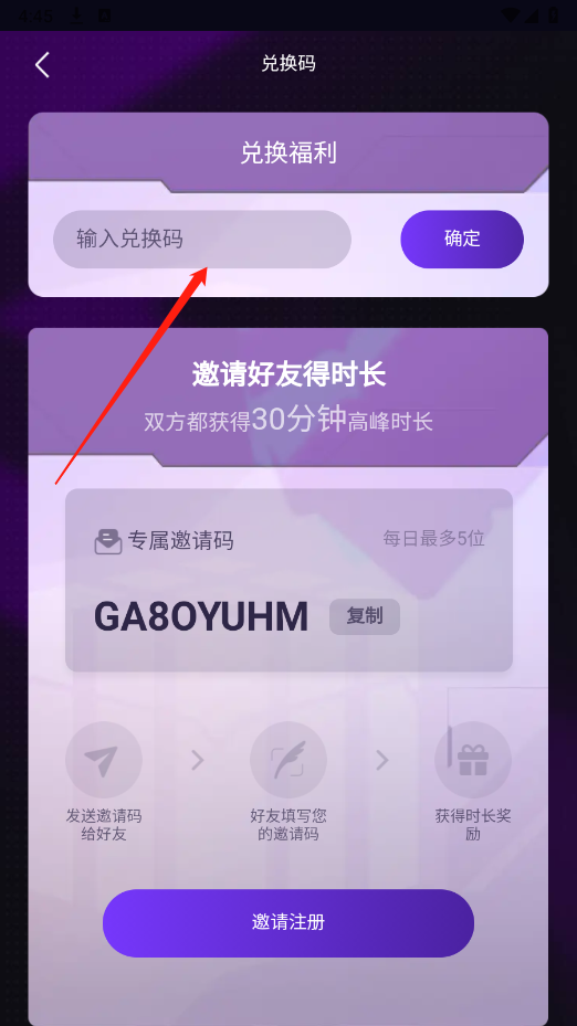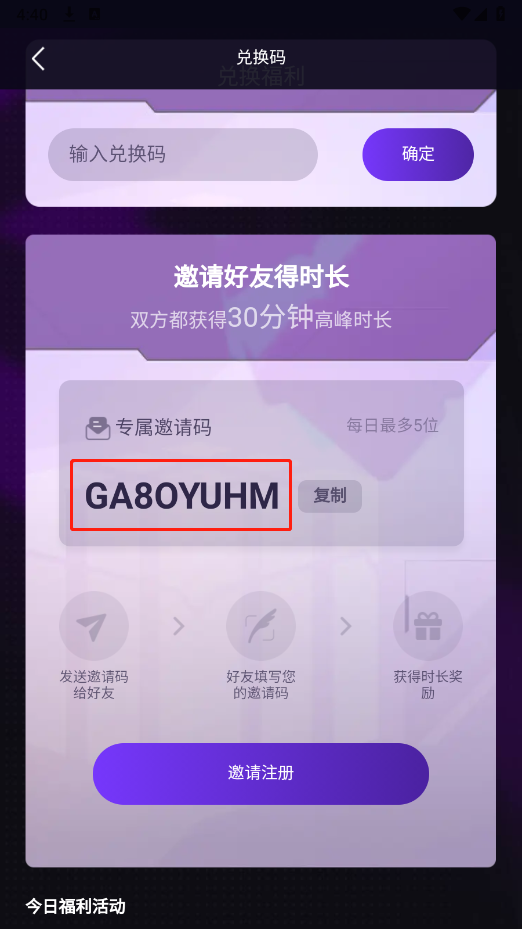 3、好友填写邀请码后会生成一个兑换码,用户输入该兑换码后,邀请方与被邀请方均可获得30分钟的高峰时长。