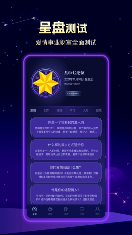 多维占卜体系:结合星座星盘与塔罗牌占卜两种方式,从多维度剖析运势走向,全方位满足用户探索命运的多样化需求。