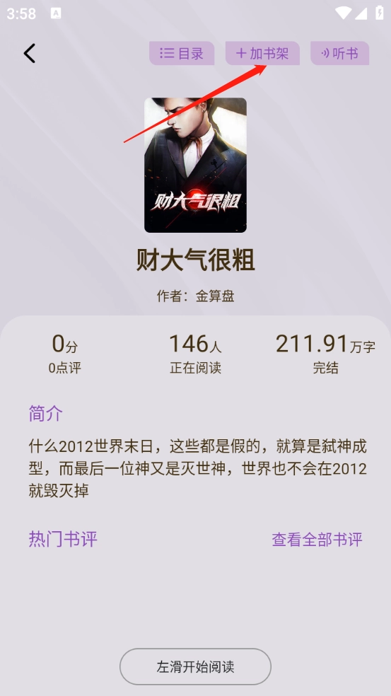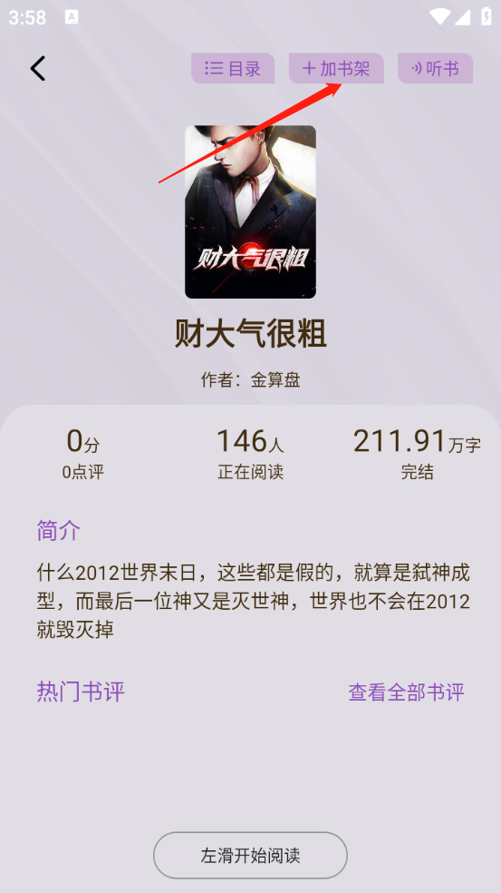 1、打开你喜欢的小说,点击右上角的“加入书架”按钮,系统会给出加入成功的提示。