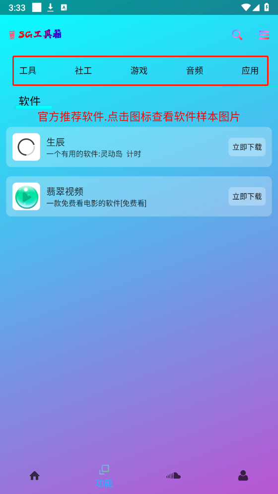 2、进入后,点击底部栏的“功能”板块,这里有超级多的类型,包括工具、游戏以及应用等。