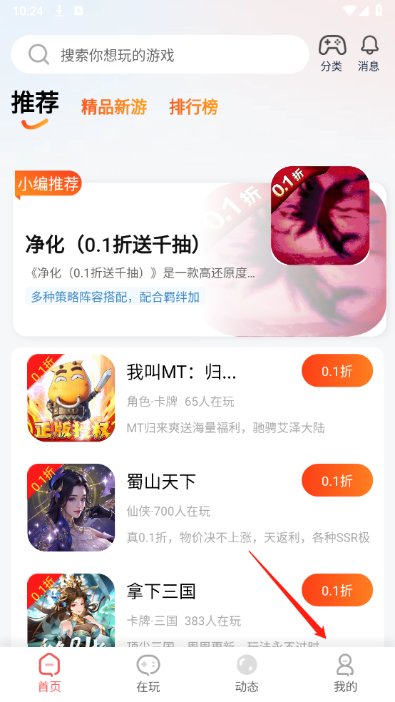 进入首页后,能看到种类丰富的游戏资源,涵盖仙侠、0.1折以及三国传奇等类型。