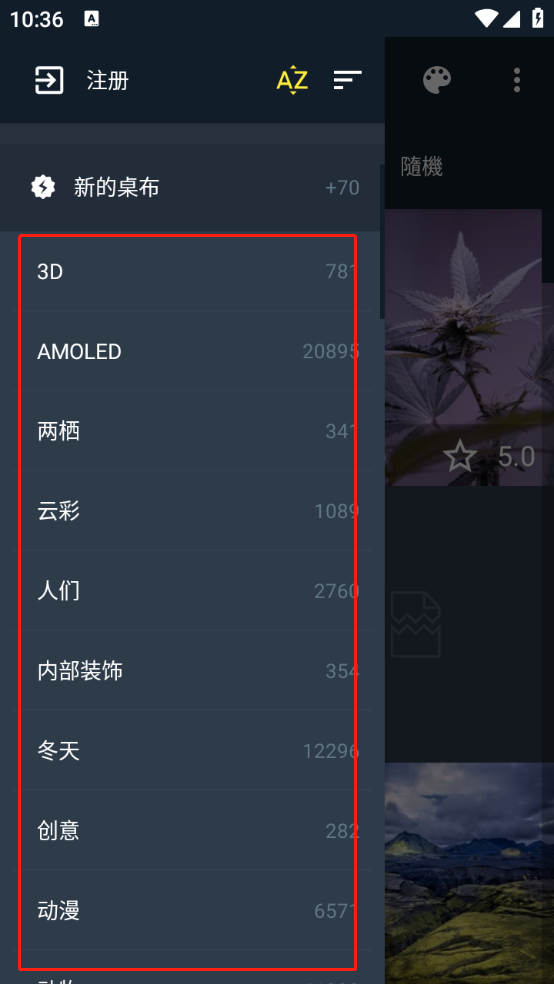 4、点击左上角的三条横线图标,这里为大家提供了各类详细的壁纸分类。