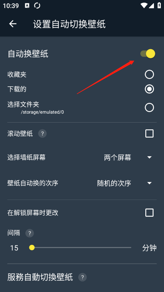 3、把“自动换壁纸”后面的按钮开启,再依据自己的需求对其他相关要素进行设置。