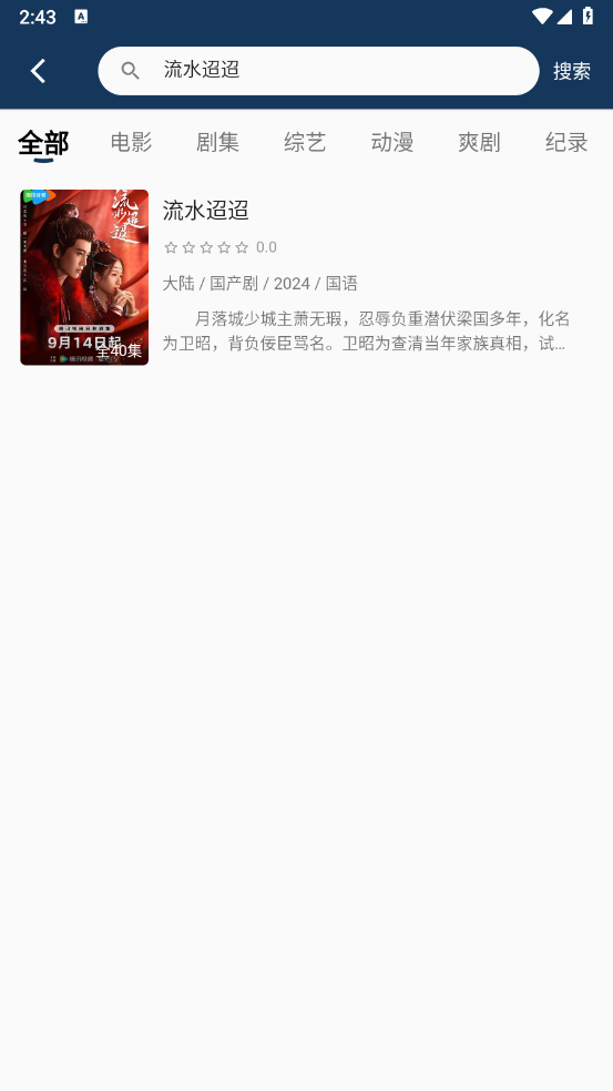 1、浏览或者搜索想看的影视剧集之后打开,比如小编打开的是“流水迢迢”。