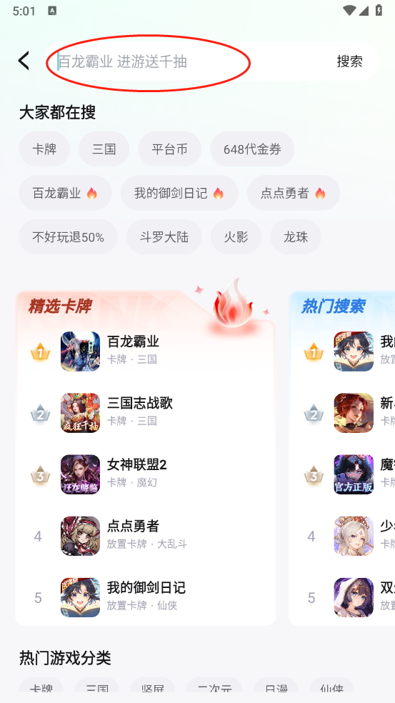 3、进入“找游戏”页面后,能看到详细的游戏资源分类,涵盖三国、卡牌、二次元等多种类型。