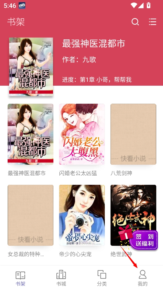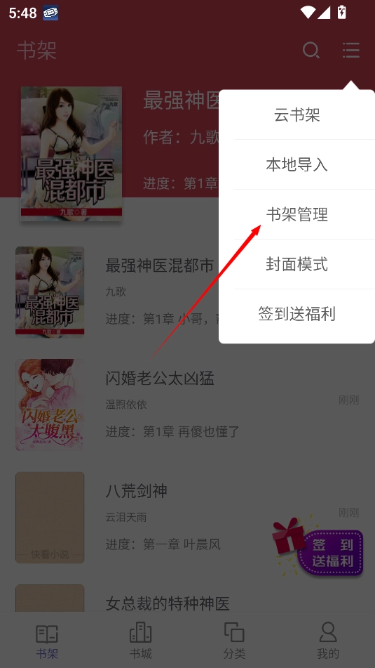 在书架页面点击上方的三条横线打开弹窗选择书架管理