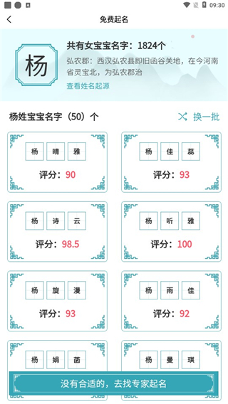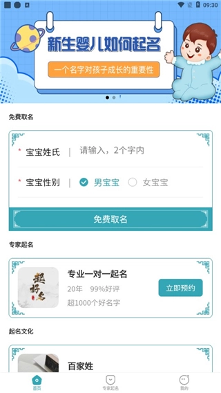 用户可输入宝宝的姓氏,点击免费取名按钮获取名字,也能预约专家进行一对一起名服务。