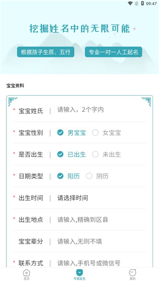 用户还能点击专家起名,把孩子的各类基本信息输入进去就行。