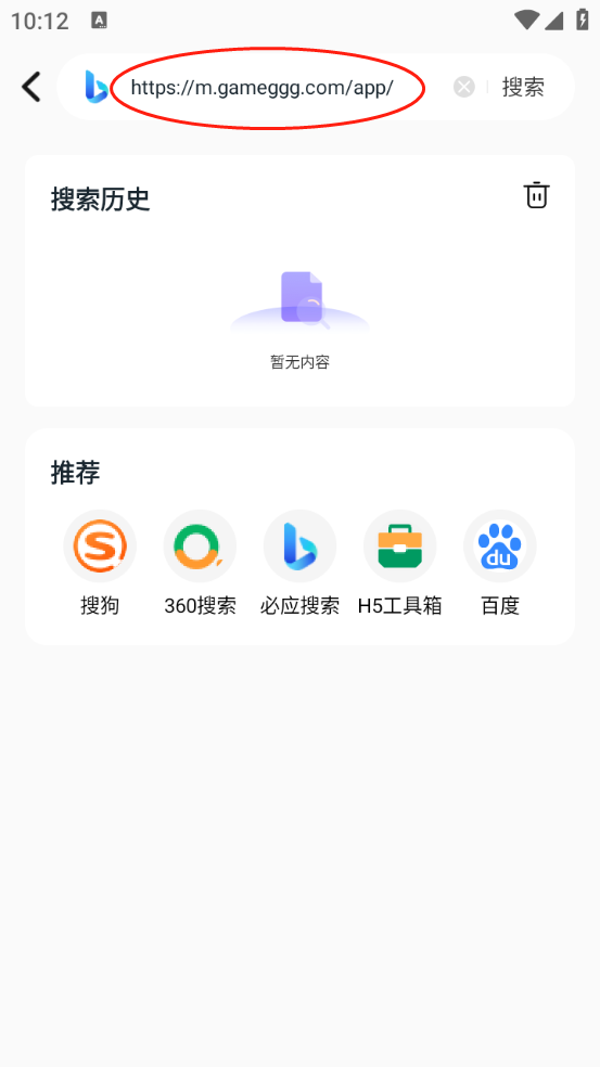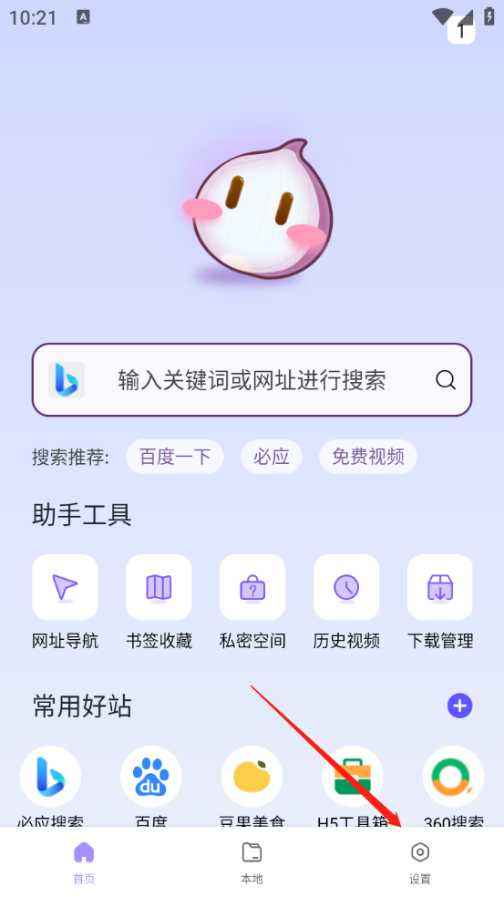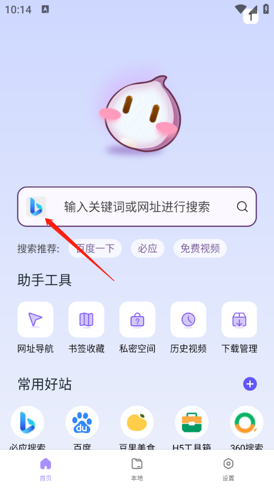 2、来到首页,点击下图中指示位置可以切换浏览器,默认的是必应搜索。