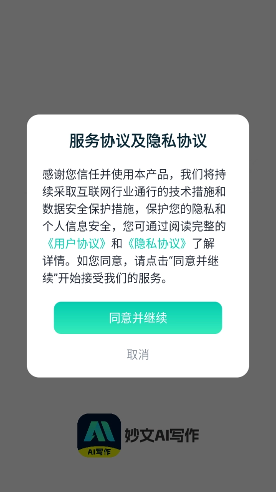 1、首先在本站安装好妙文AI写作,同意隐私政策与用户协议。