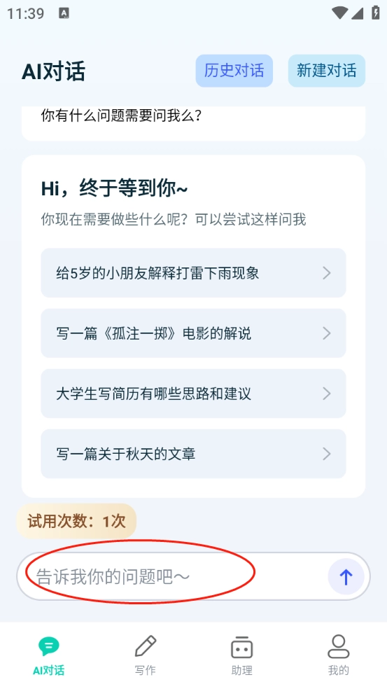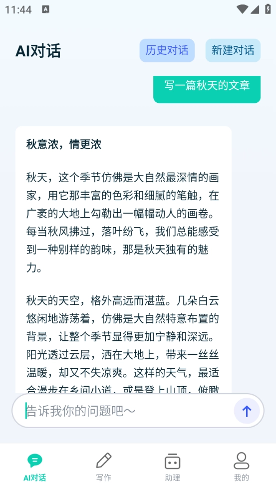 6、选择自己需要的功能点开,小编选择的是AI对话板块,输入的“写一篇秋天的文章”。