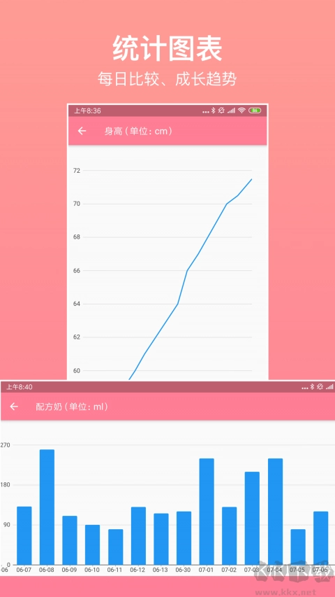【智能统计】系统会自动生成喂奶间隔、睡眠时长等数据的可视化图表,24小时动态更新,即使是混合喂养也能轻松掌握。