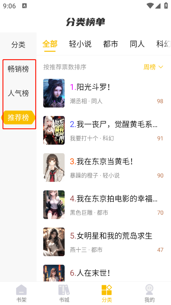 3、“分类”栏目对小说做了细致划分,涵盖都市、同人、科幻等多种类型。