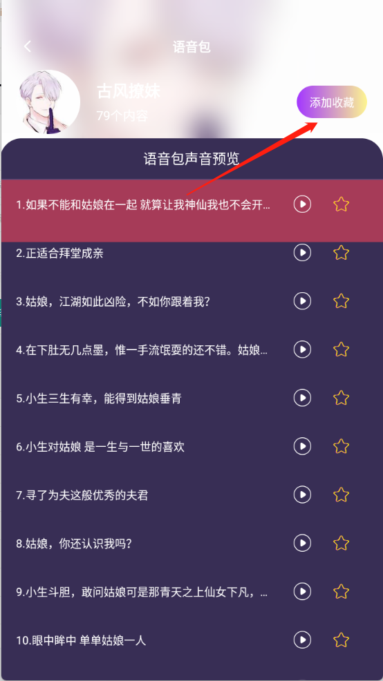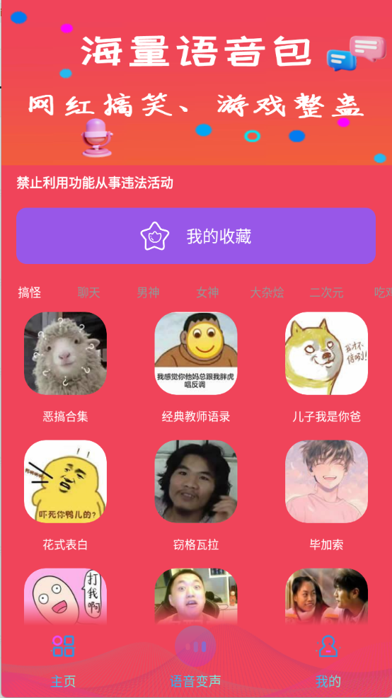 进入主页后,能看到多种类型的语音包,你可以把喜欢的语音添加到收藏夹里。