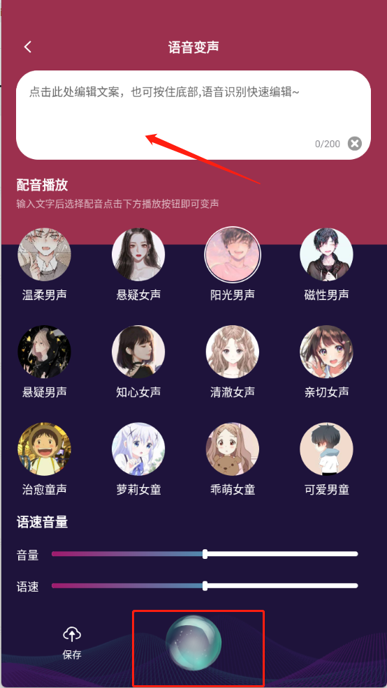 3、语音变声页面支持两种输入方式:一是在编辑框中直接输入文案,二是按住底部按钮进行语音识别。
