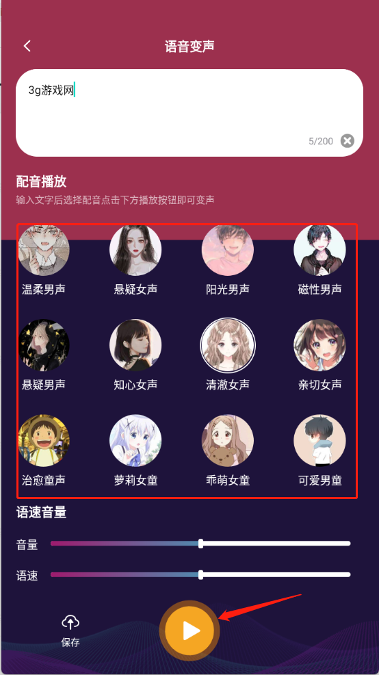 4、把内容输入完成后,挑选下方的配音选项,点击开始按钮就能实现声音变换。