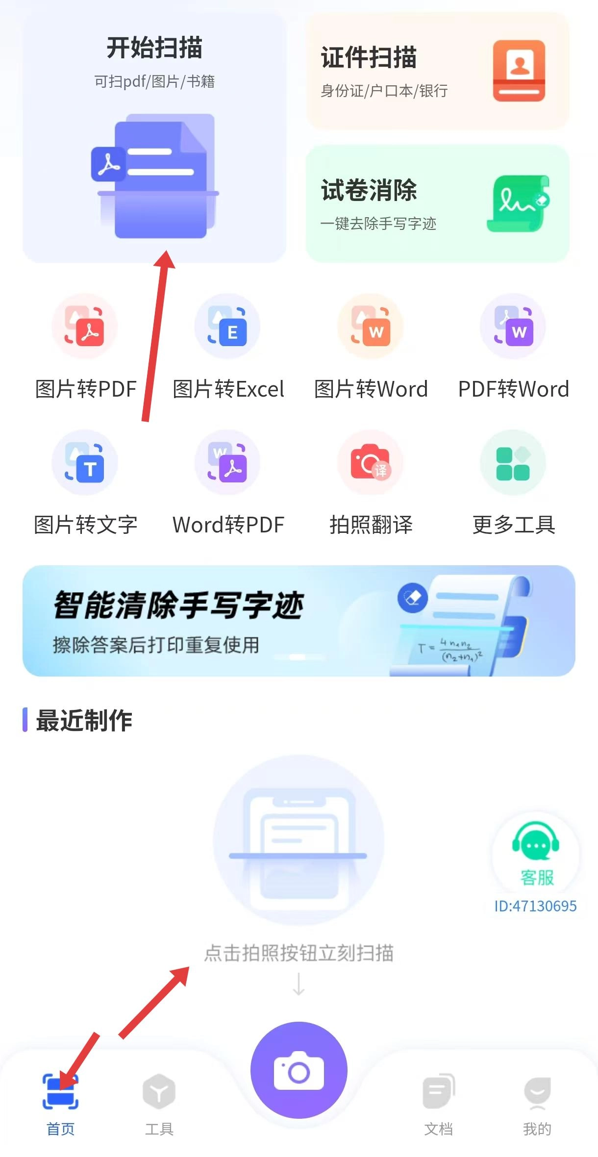 首页功能多样,包含开始扫描、证件扫描等模块,可实现图片转PDF、Excel等格式转换,同时配备拍照翻译、试卷消除等实用工具。