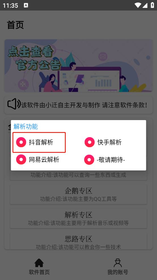 3、大家可依据自身需求进行挑选,我选择的是“解析专区”里的“抖音解析”。
