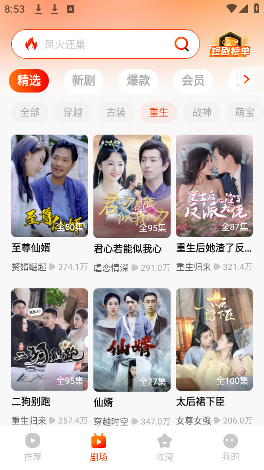 进入“剧场”页面后,能看到丰富的短剧资源分类,像穿越、古装、战神等类型都包含在内。