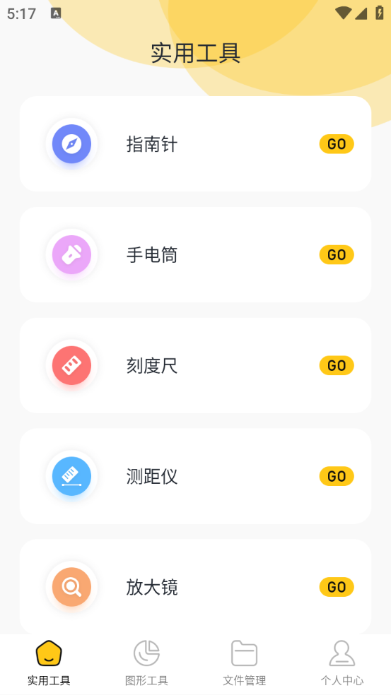 首页的“实用工具”板块包含多种工具,像指南针、测距仪和放大镜之类都在其中。