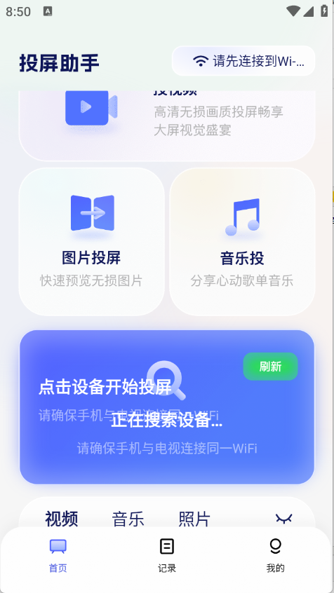 1、请确保手机和投屏电视处于同一个Wi-Fi下。