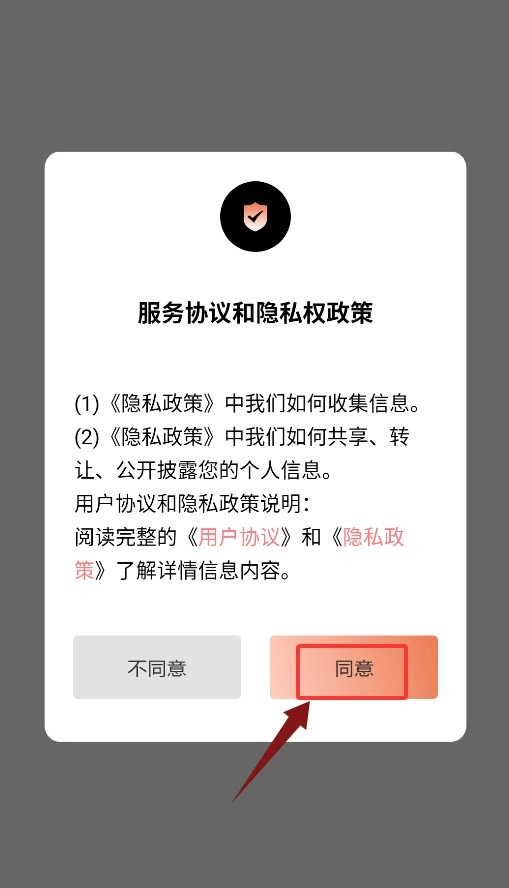 首次打开应用时,需要点击确认协议的弹窗,同意相关协议后才能进入主界面。