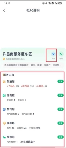 3、在豫上高速平台上,你能看到各服务点的具体服务内容、所在位置以及距离信息,只需点击导航按钮,就能顺利找到你要前往的目的地。
