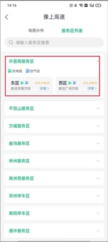 2、在豫上高速的这个位置,你能看到地图分布和服务器列表,找到你所在的服务区并点击进入详情页面。