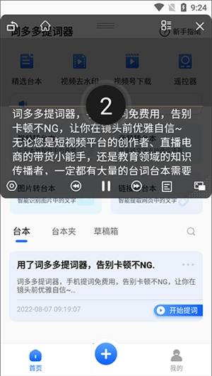 1、在首页下方任选一个台本,点击【开始提词】,随后可自主选择【悬浮窗】、【提词板】、【拍摄提词】这三种提词模式。