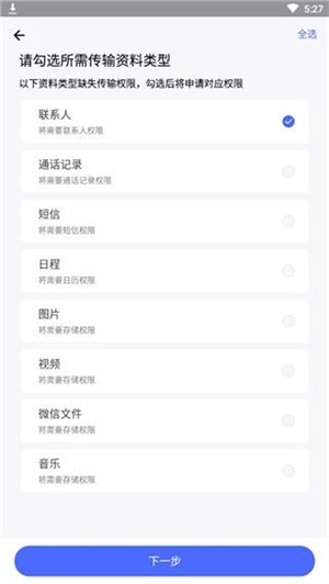 3、勾选完成后点击下一步,扫描生成的二维码即可开始将旧机上的资料传输到本机。