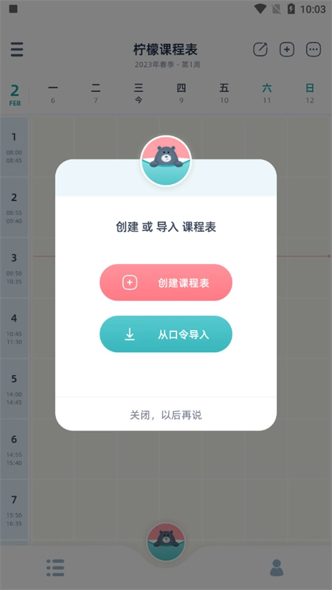 柠檬课程表手机版提供两种课表导入方式,分别为创建课程表和从口令导入。