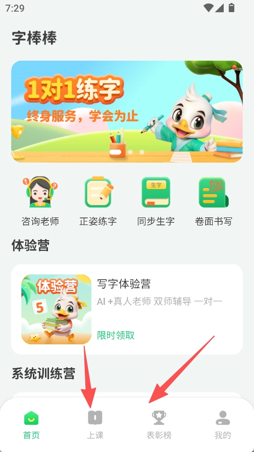 2、点击“上课”,还可进入写字体验营,有老师辅导练字。