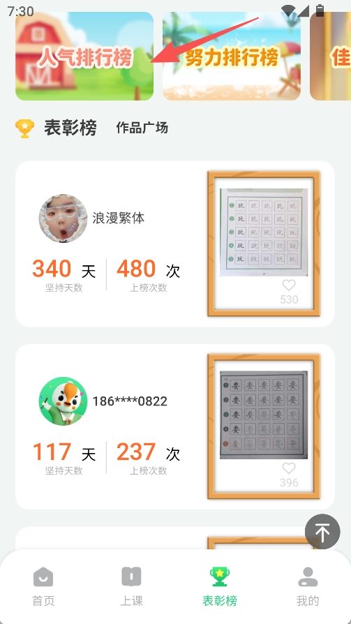 3、进入“表彰榜”,能看到人气排行榜等榜单。
