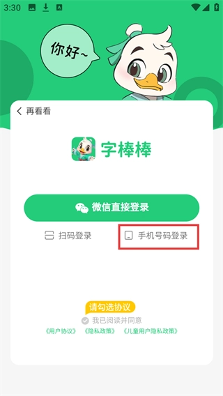 3、在登录选择界面,先勾选协议,再点击【手机号码登录】选项,切换至该登录方式的页面。