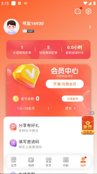 4. 点击页面底部的“我的”选项,就能看到会员中心、分享有好礼等相关功能。
