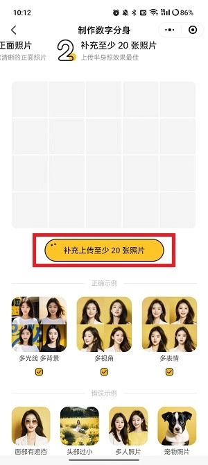 接下来请上传至少20张清晰的照片,建议优先选择上半身的,同时尽量让照片的拍摄角度、人物表情以及光线条件更加多样丰富。