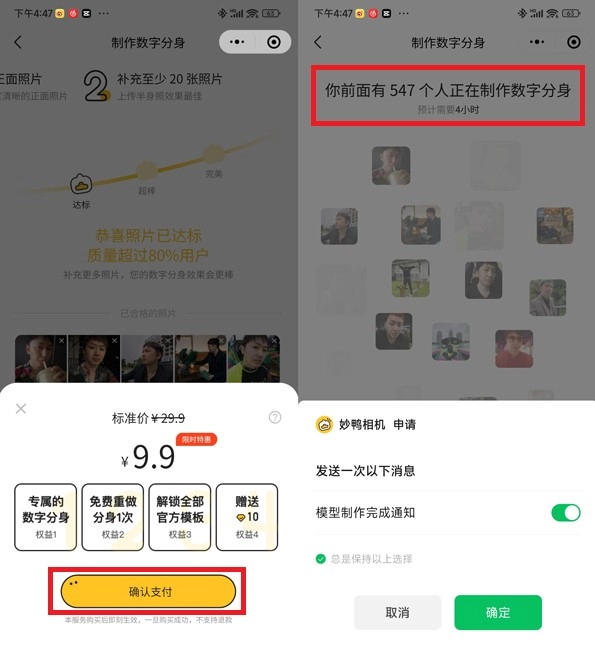 照片上传完成后,需要支付9.9元费用,系统会依据当前排队人数启动制作流程,通常30分钟内即可完成。