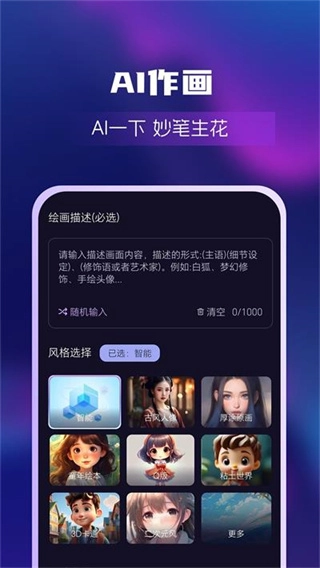 AI绘画创业帮是一款功能丰富的专业AI手机绘画软件,其安卓最新版本依托尖端AI智能技术,为用户提供专业的绘画功能。该软件可深度解析用户输入的关键词、图像或情感等各类元素,用户只需一键操作,就能轻松生成更多心仪的优质画作。