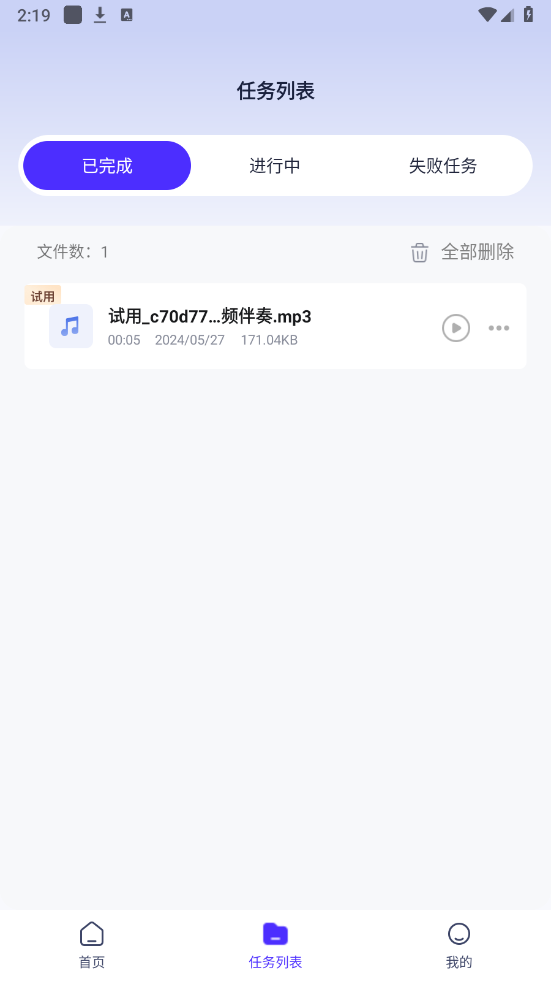 7、点击音频文件的播放按钮即可试听,也可点击三个点的图标进行重命名、分享、删除等操作。