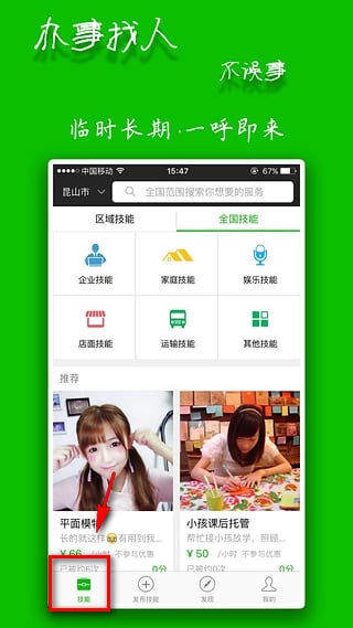 找人办事:您可以在首页直接搜索所需技能,找到目标技能后,可通过留言、发送语音或文字信息、拨打电话,或者直接预约等方式与对方沟通,从而促成交易。