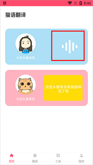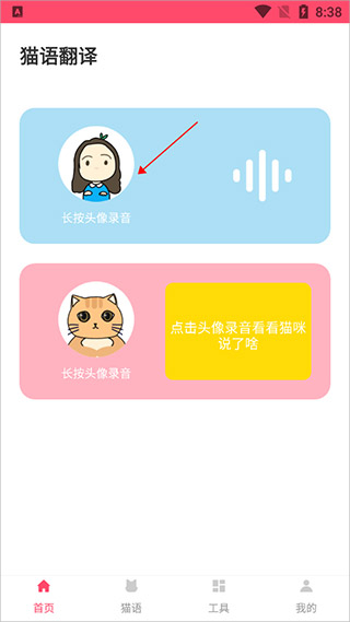 1、当用户进入应用,在首页长按猫咪头像即可进行录音。