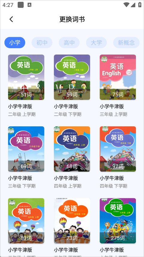 3、单词本内为大家提供了小学到大学的众多单词书,大家根据自己的需求添加