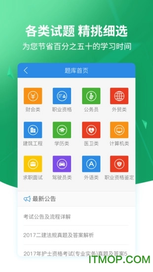 财会类涵盖会计从业、会计职称、注册会计师、经济师、内审师、规划师、税务师;职业资格类包含证券、导游、保险、人力资源、司法、教师、营养师、软考、计算机、雅思、托福、英语四六级;公务员类涉及国考、省考、政法干警、村官、事业单位;建筑类有一建、二建、造价、安全工程师、电气工程师、招标师、建筑八大员、消防工程师;学历类包括高考、中考、成考、考研、硕士、自考;医学类则有执业药师、执业医师、执业护士、卫生资格、考研卫生综合等。