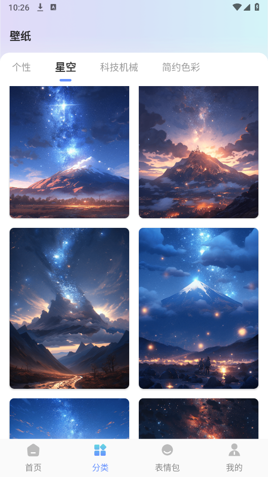 3、“分类”板块里汇聚了超多类型的壁纸资源,像个性、星空、科技机械这类都有。