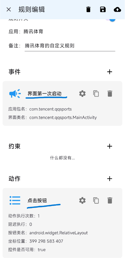 7、之后会生成一个规则,具体的规则含义是“当第一次启动所在的界面,会自动点击选中的按钮”