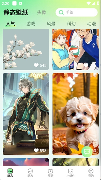 星动壁纸软件安卓最新版为用户打造个性化桌面提供便捷的服务,你可以通过软件的动态/静态壁纸自由选择打造舒适的壁纸界面,同时软件中带来独特的互动壁纸与小组件自定义,每一项都可以为用户的个性化界面提供服务。